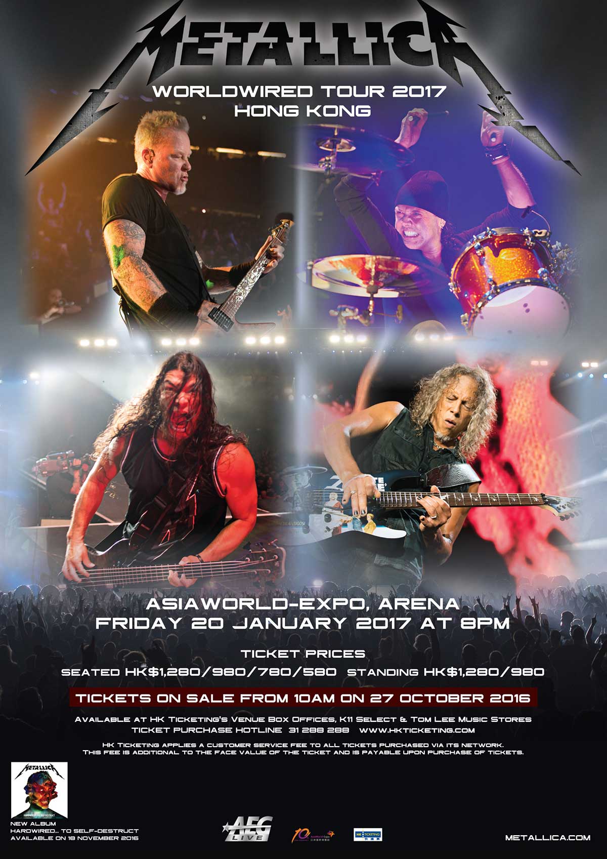 Metallica will play their first gig in Hong Kong on 20 January 2017 at the Asia World-Expo Arena as part of their World Wired tour. Tickets priced at $1,280, $980, $780, $580 go on sale from 10am on the 27 October through HKTicketing