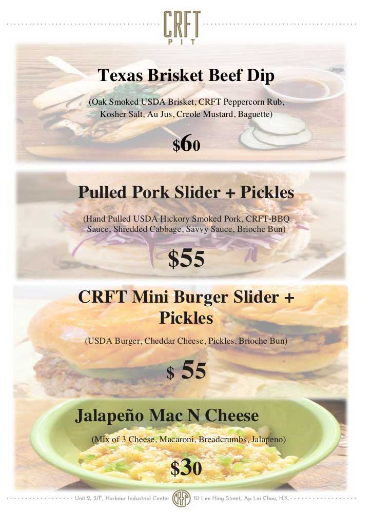 Located in Ap Lei Chau Crft-Pit specialises in American BBQ and their booth features a four item menu. The Texas Brisket Beef Dip ($60) is oak smoked USDA brisket with a peppercorn rub served with creole mustard in a baguette. The Pulled Pork Slider with Pickles ($55) has hickory smoked USDA pork served in a brioche bun withcrft bbq sauce and shredded cabbage. They also have Mini Burger Sliders ($55) and Jalapeno Mac and Cheese ($30). Add a drink to create a combo for $80