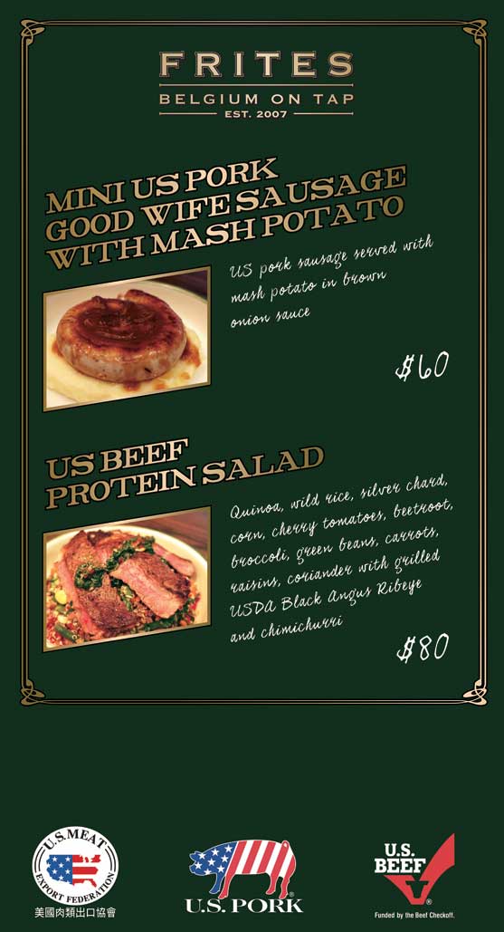 Frites the Belgian bar with four outlets locally will be serving mini versions of two of it’s popular menu items. The palm sized “US Pork Mini Good Wife Sausage with Mash Potato’ $60 is very tasty. Or get healthy with a ‘US Beef Protein Salad’ $80.