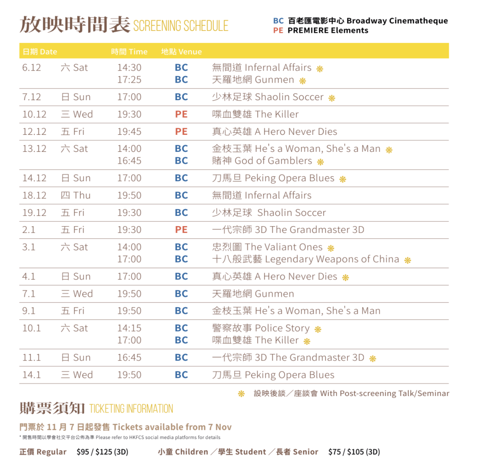Films featured include: The Blood of Heroes (1989) and Dao Ma Dan (1986) both of which premiered in Hong Kong. The rarely exhibited The Grandmaster 3D (2013) and 無間道 Infernal Affairs, 忠烈圖 The Valiant Ones, 金枝玉葉 He’s a Woman She’s a Man, 十八般武藝 Legendary Weapons of China…