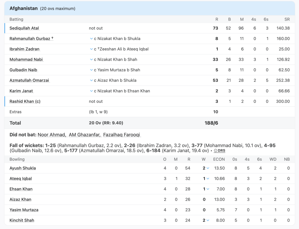 As good as that period was for Hong Kong, it also brought Omarzai to the crease and he was so game aware. The fast bowlers returned in the 17th over and it was go time. The next 18 balls yielded 60 runs. Omarzai went 6, 6, 6 and 4 against Ayush Shukla to bring up his half-century off just 20 deliveries. From the simple, clear-the-front-leg slog to the cheeky ramp past the keeper, the Afghanistan allrounder showed impressive range on a difficult batting pitch.