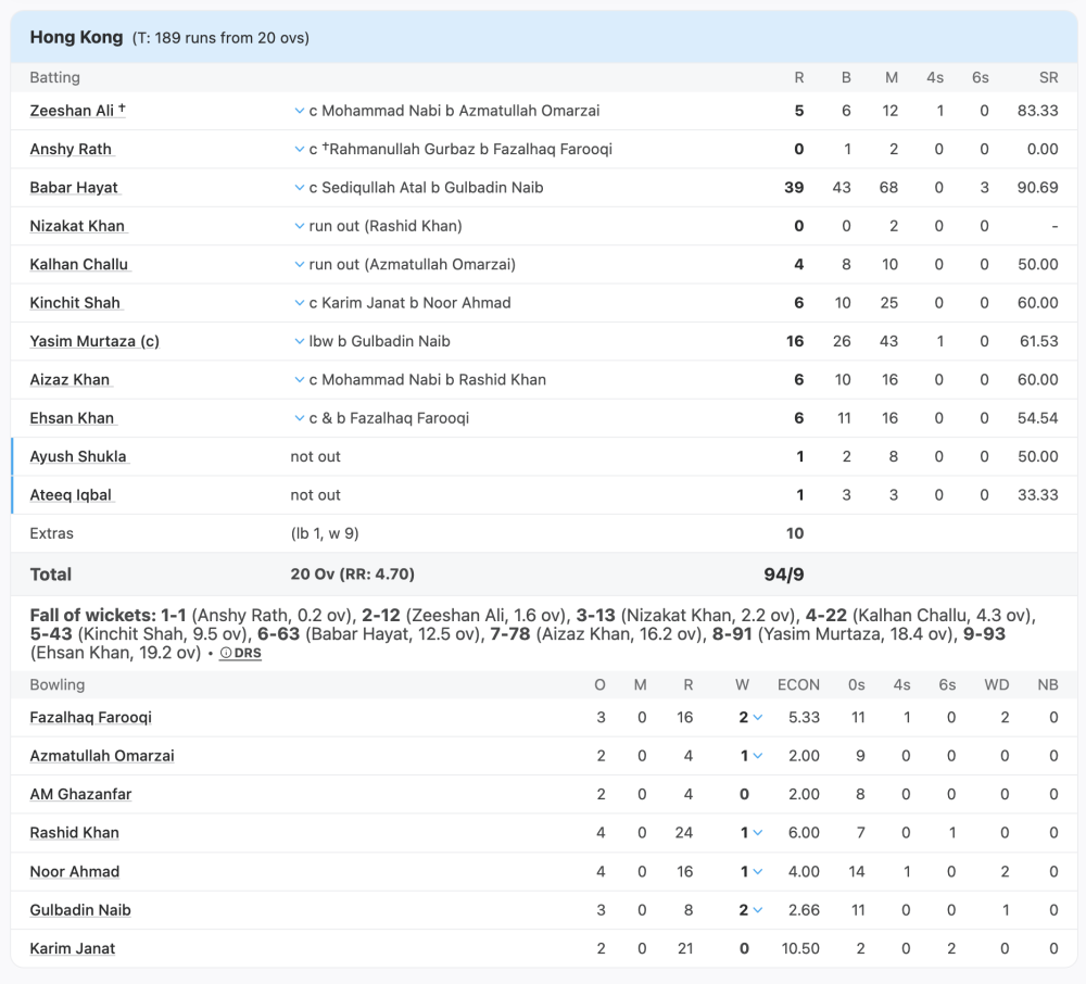 Omarzai was responsible for one of two blink-and-you’ll-miss-it run-outs, which, coming on the back of a Hong Kong fielding performance that included three dropped catches, was cricket working a little too hard to highlight the gulf between the two sides. Full Member Afghanistan made 188 for 6. It was 94 too many for their Associate nation opposition.