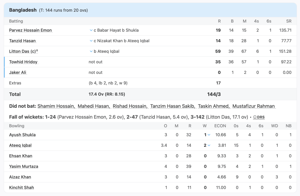 Taskin Ahmed was expensive but got the early breakthrough by dismissing Anshy Rath. He then removed Aizaz Khan in the final over.