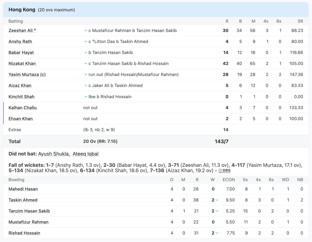 Hong Kong mustered a total of 143 for 7 in 20 overs against Bangladesh, after being inserted by Bangladesh in Abu Dhabi. They started shakily, with early wickets and a sluggish start for Zeeshan Ali (30) and Nizakat Khan (42) keeping Bangladesh in control.