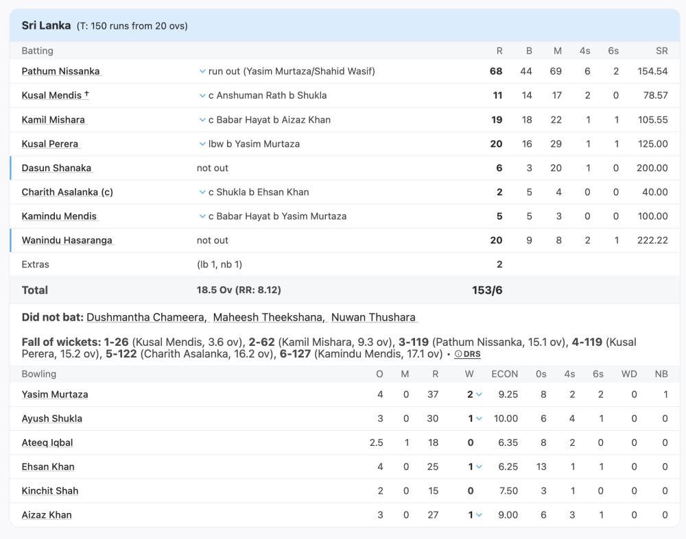 But their catching was poor. Nissanka was dropped no fewer than three times – twice by Ehsan, who couldn’t hold sharp return chances. Kusal Perera was also dropped twice in the same Ayush Shukla over, though one of those chances was exceedingly difficult. Had some of those stuck, though, Hong Kong could truly have made Sri Lanka sweat.