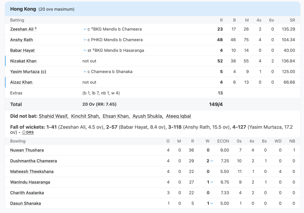 Hong Kong clambered to a respectable 149 for 4, as Nizakat Khan drove them through the middle and back end of the innings, after Anshy Rath had held down the fort in the early overs. The two combined in the middle for a partnership worth 61 off 43 balls – Nizakat contributing 33 off 22, while Rath went at a slower pace.