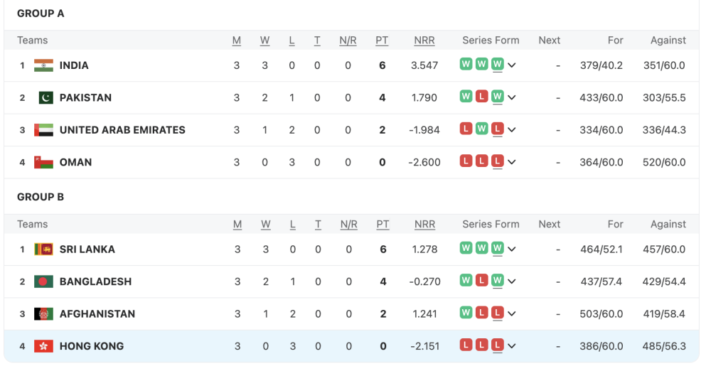 Men's T20 Asia Cup Table