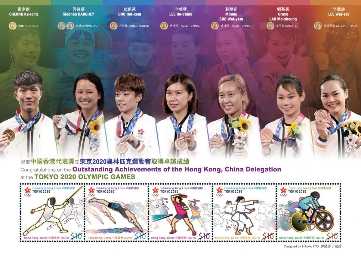 All of Hong Kong’s Olympic medallists Cheung Ka Long, Siobhan Haughey, Doo Hoi Kem, Lee Ho Ching, Minnie Soo Wai Yam, Grace Lau and Lee Wai Sze will be featured on the commemorative sheetlet to be issued on 28 October, 2021.