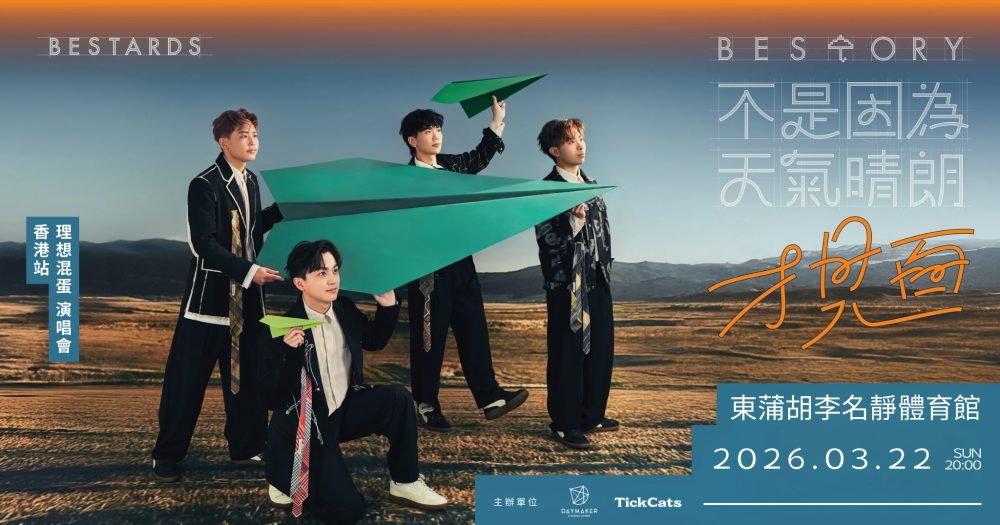 « All Events Bestards 22 March @ 8:00 pm $780, $480 « Koda Kumi Leon Lai » Bestards Date: 8pm, 22 March 2026 Venue: Kitty Woo Stadium Tickets: $780, $480 Share:Share on X (Twitter)Share on FacebookShare on PinterestShare on LinkedInShare on E-mailShare on RedditShare on WhatsApp Add to calendar Google Calendar iCalendar Outlook 365 Outlook Live Details Date: 22 March Time: 8:00 pm Cost: $780, $480 Event Categories: 2026, Concert, Music, Nightlife, Performing Arts Event Tags:Bestards, concert, HKconcert, HKgig, HKlivemusic, HKmusic, HKnightlife, music Venue Kitty Woo Stadium 2, Tsat Po Street San Po Kong, Hong Kong + Google Map Related Events Hong Kong Arts Festival 27 February - 30 March LCK Cup Finals 28 February @ 4:00 pm Seventeen 28 February @ 6:00 pm