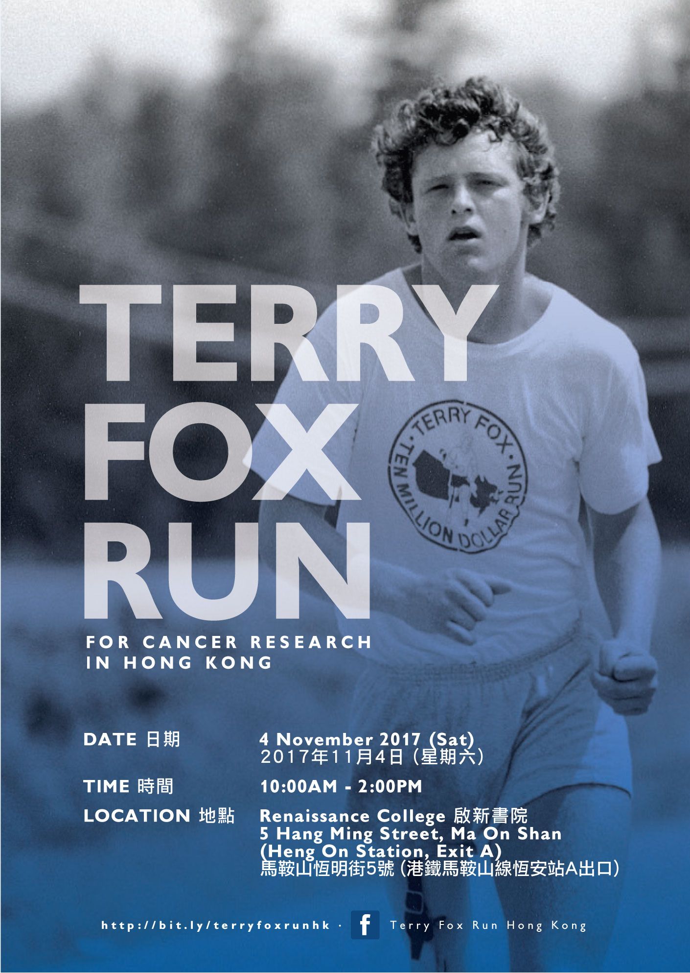 The Terry Fox Run is an annual charity event inspired by a young Canadian activist. The 5th Terry Fox Run Hong Kong (TFRHK) will be held on Saturday 4 November 2017 at Renaissance College in Ma On Shan.