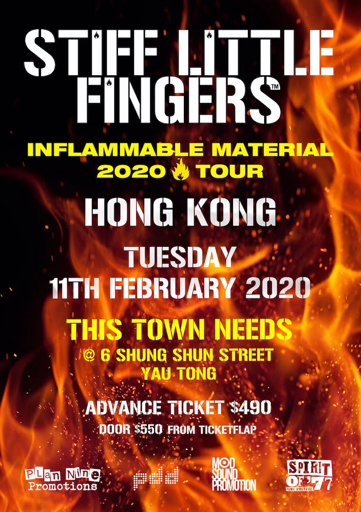 This Town Needs (TTN) 1/F Ocean One, 6 Shung Shun Street, Yau Tong, Hong KongStiff Little Fingers - Inflammable Material 2020 Tour Support: The Side Burns Date: 7pm, 11 February, 2020 Venue: This Town Needs (TTN) Tickets: $550, $490 (advance) from Ticketflap