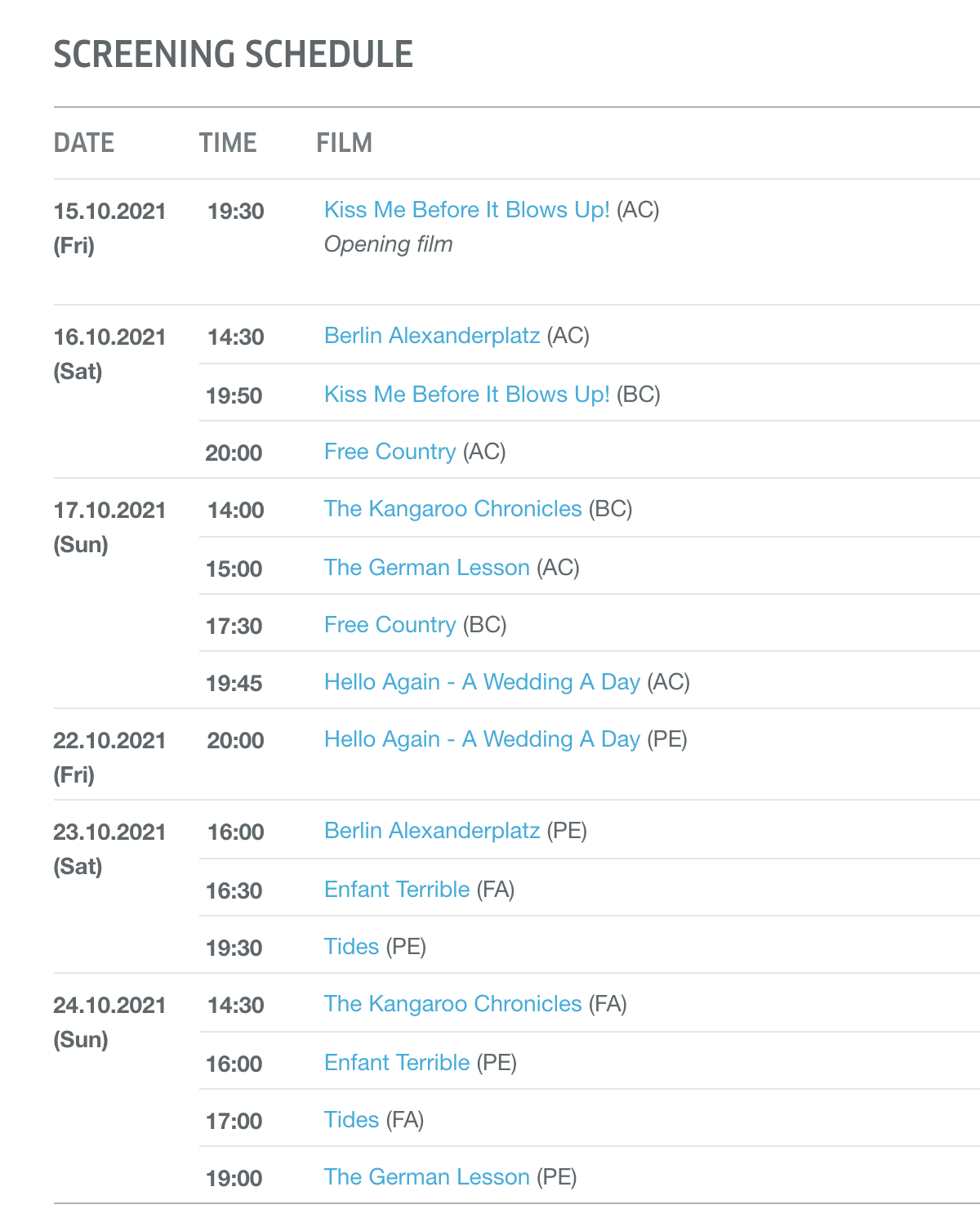 Kiss Me Before It Blows Up!, Berlin Alexanderplatz, Free Country, The Kangaroo Chronicles, The German Lesson, Hello Again – A Wedding A Day, Enfant Terrible, Tides