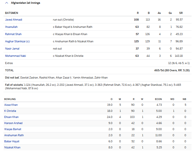 Nabi fell for 63 off 44 balls with Kyle Christie picking up his first wicket of the innings and with that the declaration came with Afghanistan finishing on 465-5 (lead of 323 on first innings).