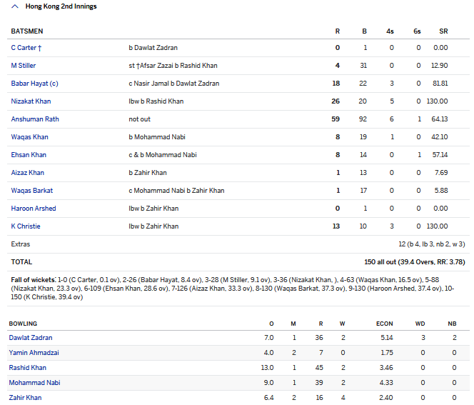 Rath bought up a deserved half century and remained undefeated on 59 when Kyle Christie became the last wicket to fall. Hong Kong were bowled out in their second innings for 150 and Afghanistan were comprehensive winners by an innings and 173 runs.