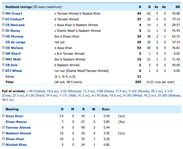 The spinners did well to pull the innings back after Scotland built a solid base at 49-0 in 10 overs. Ehsan Khan (1-33) also proved difficult to get away.