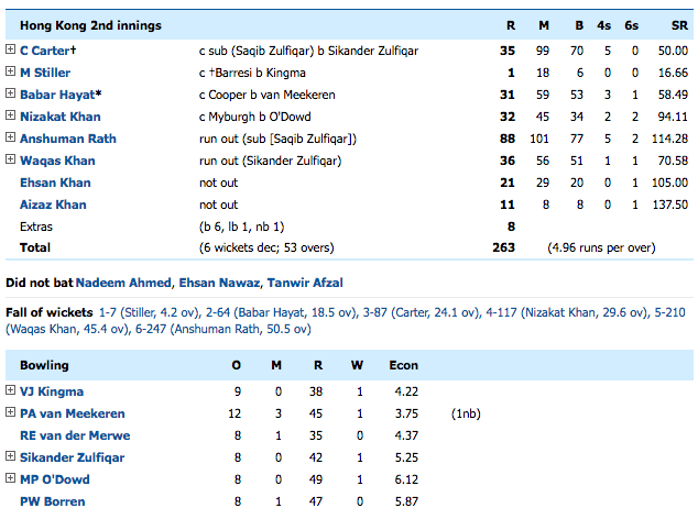 Quick runs were in order for Hong Kong to set the Dutch a target and Chris Carter (35), Nizakat Khan (32) and Babar Hayat (31) ensured a solid start to the innings. That allowed the in-form Rath to play with freedom and he delivered a 101-ball 88 that included 5 fours and 2 sixes.