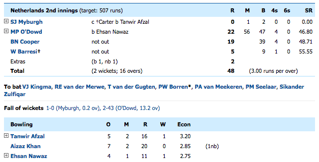When the declaration finally came, Netherlands had to see out a minimum 116 overs to save the game. And it didn’t start well with Tanwir Afzal getting the edge of Stephan Myburgh in the first over in the innings, just as he’d done in the first.