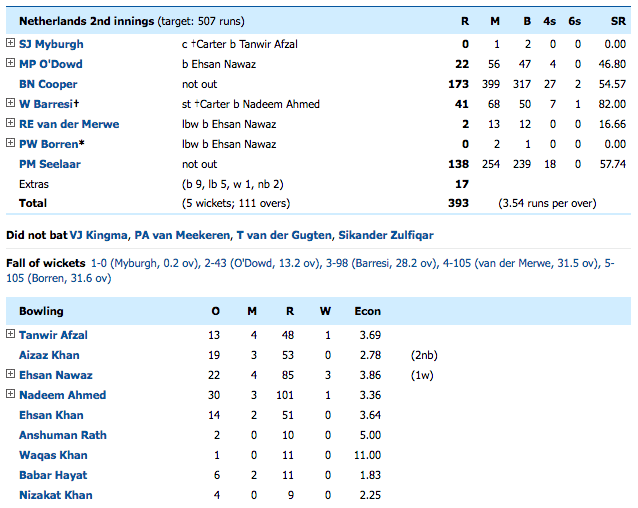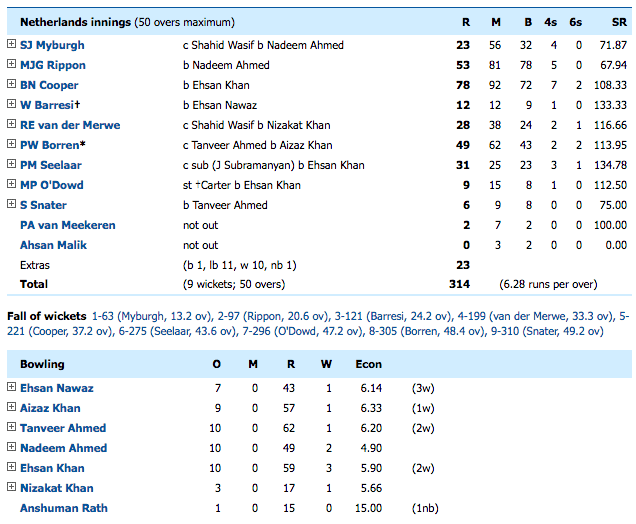 Ben Cooper and Roelef Van Der Merwe combined to finally get the Dutch innings going. They put on 102 before left-arm spinner Nadeem Ahmed drew the edge of Cooper for 52. And then two balls later he struck again to send Wesley Barresi back for a duck.
