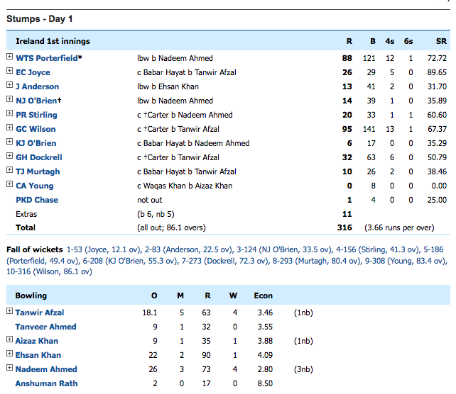 In response, Tanwir Afzal’s opening spell of 2-18 gave Ireland to much work to do in the last 10 as they were dismissed for 129.