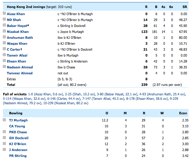 The Irish mounted a charge through Greg Thompson (44 off 32) and Kevin O’Brien (32 off 24) but the required rate proved too much as Hong Kong ran out easy winners. Aizaz Khan finished with 3-10.