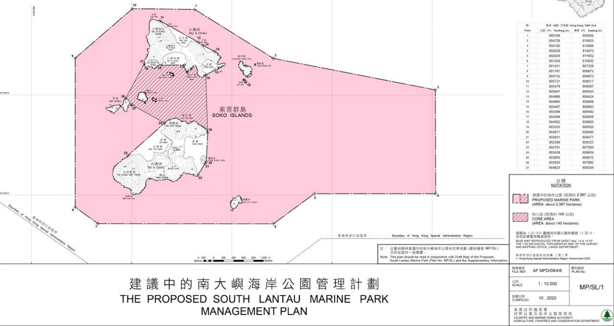 The draft map of the proposed 2,067 hectares SLMP has been prepared by the Country and Marine Parks Authority in accordance with the Marine Parks Ordinance (Cap. 476) and released for public inspection and comment within 60 days (28 Feb, 2021) of its 31 December 2020 publication. Details are available on the AFCD’s website: www.afcd.gov.hk/english/country/cou_vis/cou_vis_mar/cou_vis_mar_wha/mp_sl_draftmap.html.