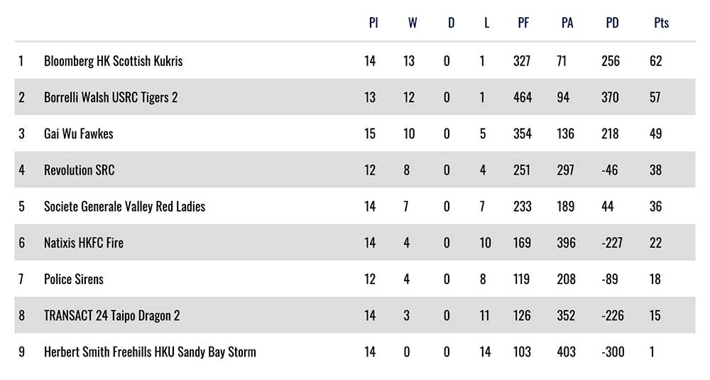 Valley enters the final league match of the season leading the Premiership with an unbeaten record and 22 points. Gai Wu are second on 19 points, while Tigers breakout season isn’t truly reflected by their 7 points. Winless Kowloon prop-up the table.