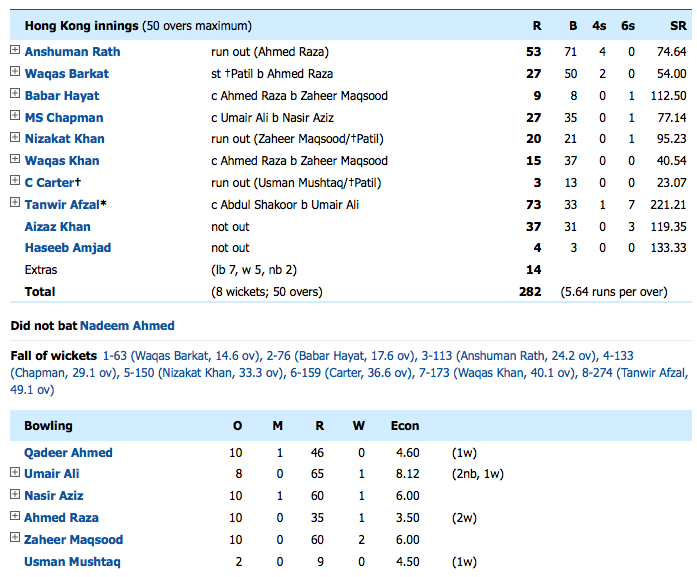 From the time Hayat was dismissed for an innings that came off just 80 balls and included 5 sixes, Hong Kong launched 98 runs off the last eight overs – atoning for Wednesday’s encounter where PNG restricted HK to just 60 from the last 10.