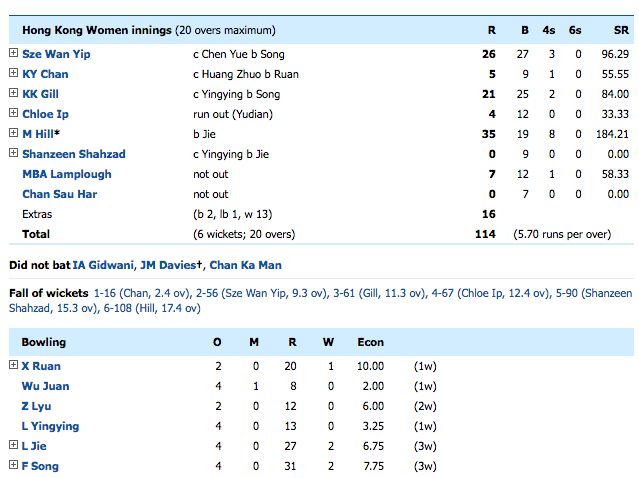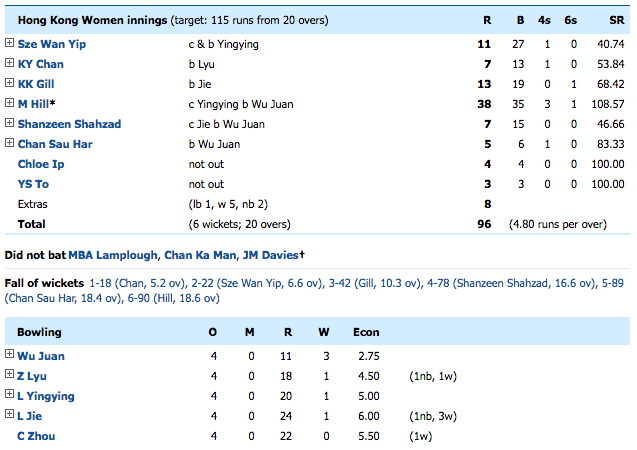 Opener Sze-Wan Yip continued her great form, scoring 26 runs off 27 balls. Although her opening partner Kary Ka-Ying Chan was caught in the third over, Keenu Gill kept the scoreboard moving with 21 as Hong Kong reached 1-56 in the 10th over.