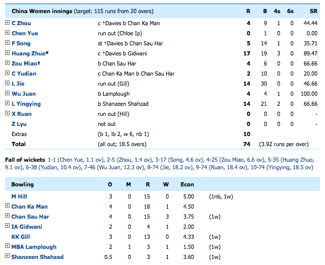 Aggressive running from China and some missed fielding from the home team contributed to China’s total of 114. On the flip side, the running and occasional miscommunications between batsmen resulted in four run-outs for China.