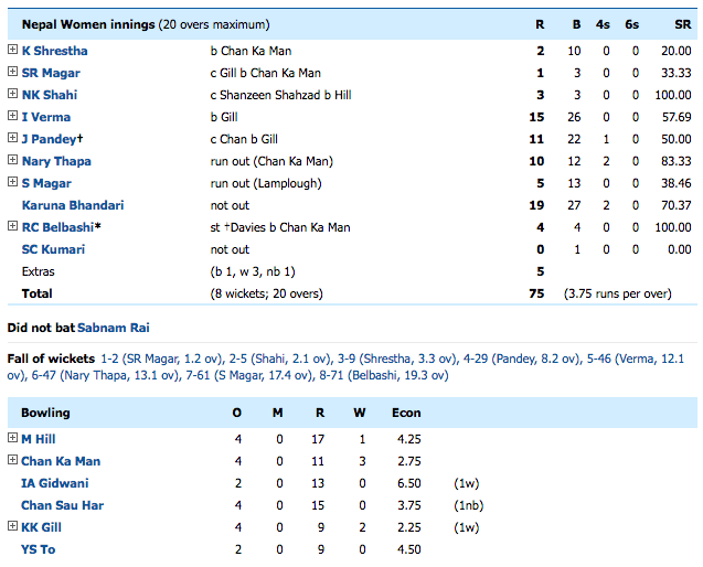 Batting first, Nepal’s innings was salvaged by number eight batter and eventual Player of the Match Karuna Bhandari. Her 19 not out, off 27 balls in the last six overs of the innings proved to be the difference. Indu Barma’s 15 in the first half of the innings was also crucial to Nepal’s 75 runs in total.