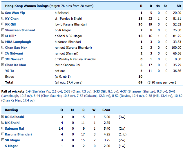 Hong Kong’s response started off well with opener Ka-Ying Chan’s 18 off 21 and Keenu Gill’s 10 off 19. Captain Mariko Hill scored 13 off 16 from number 5. But Hong Kong collapsed going from 33/1 to 58/9. After an elaborate celebration of Mariko Hill’s wicket – who was out looking to smash the ball around, when with Hong Kong’s required run-rate at less than three an over all that was needed was for her to milk the singles, rotate the strike and stay there till the end – Nepal’s bowlers calmed themselves and finally picked up the last wicket with two overs and two balls left.