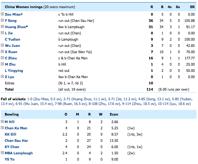 But the 71-run partnership between Feng-Feng Song (36 off 34) and Zhuo Huang (31 off 34) was killer partnership for Hong Kong.