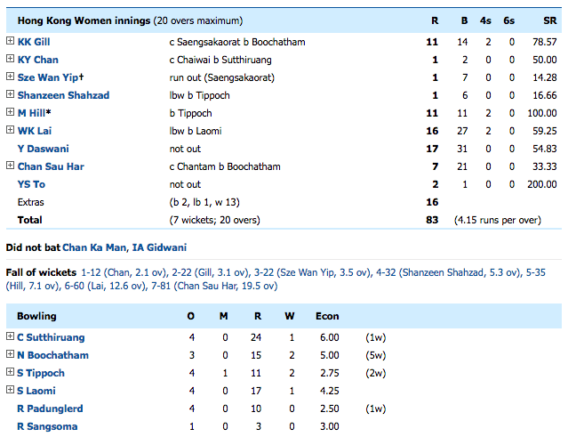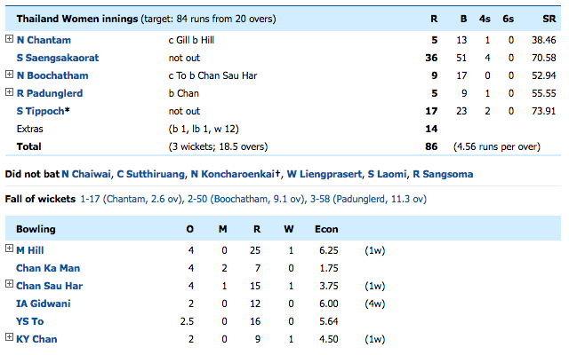 After winning the toss and electing to bat first, Thailand struggled loosing four wickets in the first seven overs with just 17 runs on the board. Hong Kong Captain Mariko Hill took two of the wickets and off spinner Ka-Man Chan bowled a superb three maiden spell and took a wicket.